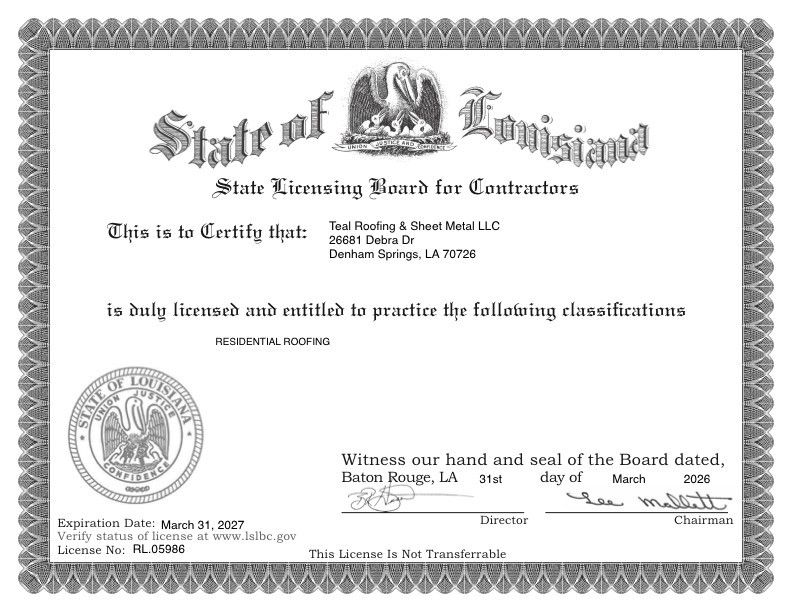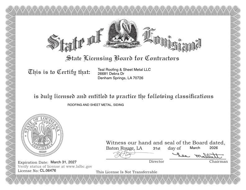 With over 30 years of combined experience, Teal Roofing & Sheet Metal was founded on a simple principle: Do it right the first time. Based in Walker, we saw a need for a roofing contractor that combines "old-school" craftsmanship with modern technology. We don't just "install" roofs; we engineer them to withstand Louisiana’s unique climate. From our headquarters, we serve a 100-mile primary radius—covering Baton Rouge to New Orleans—but our reputation for quality takes us to commercial and residential projects across the entire state.